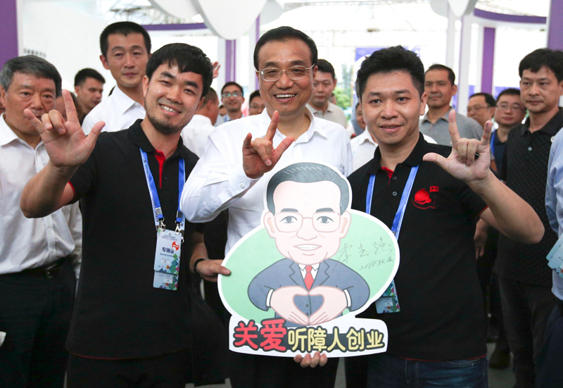 2016年10月12日下午全國雙創(chuàng)周深圳主會場上動(dòng)人的一幕。李克強(qiáng)對這一創(chuàng)業(yè)團(tuán)隊(duì)給予特殊關(guān)注,并應(yīng)邀在“關(guān)愛聽障人創(chuàng)業(yè)”畫板上簽上自己的名字。(資料圖)