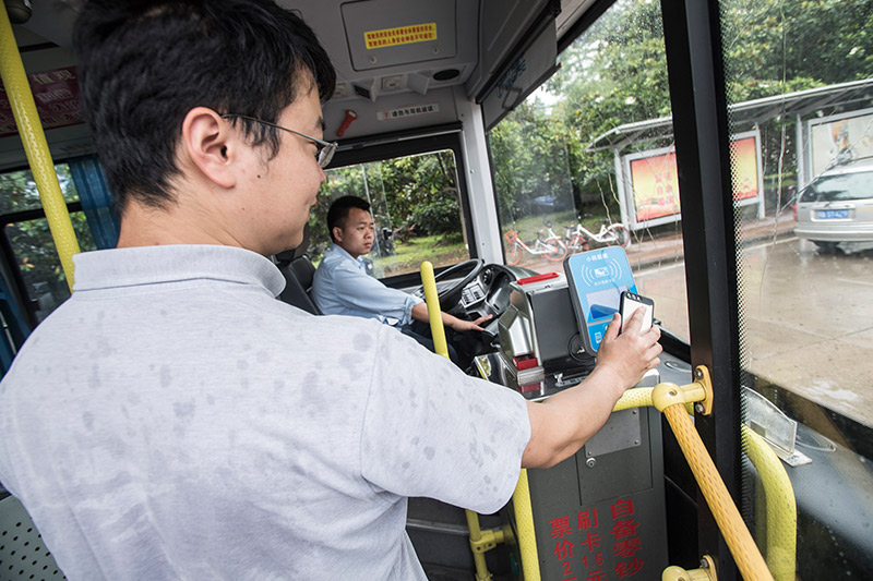 6月15日,一名乘客在湖北武漢用手機(jī)刷支付寶搭乘公交車。