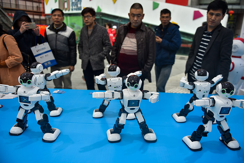1月14日,市民在開街后的深圳華強(qiáng)北觀看機(jī)器人表演。