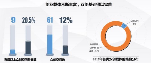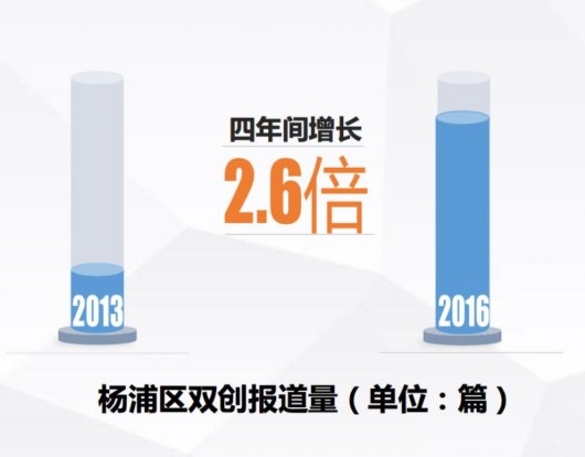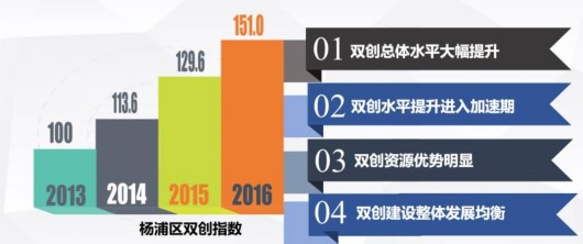 經(jīng)過(guò)指標(biāo)測(cè)算顯示,以2013年作為基期,楊浦區(qū)“雙創(chuàng)指數(shù)”從2013年的100(基期賦值)上升至2016年的151.0,增幅高達(dá)51%。其中,2016年較上年增長(zhǎng)16.5%,成為歷年增速增長(zhǎng)高的一年,雙創(chuàng)發(fā)展增速逐年提升。此外,各分項(xiàng)指數(shù)也均有提高,其中以雙創(chuàng)影響指數(shù)增長(zhǎng)為強(qiáng)勁,從2013年的100增長(zhǎng)到了2016年的153.1,較上年增長(zhǎng)22.8%。“雙創(chuàng)影響力和成果的增幅比要素和環(huán)境明顯,這也表明,創(chuàng)新的要素和環(huán)境需要長(zhǎng)時(shí)間的投入來(lái)改善,創(chuàng)新創(chuàng)業(yè)的發(fā)展需要積極進(jìn)取,還需要厚積薄發(fā)、沉得住氣。”楊浦區(qū)發(fā)改委張?zhí)鞜槺硎?。?bào)告顯示,近年來(lái)?xiàng)钇謪^(qū)各類(lèi)雙創(chuàng)載體面積(含老廠房改造)持續(xù)擴(kuò)大,截至2016年,楊浦區(qū)各類(lèi)雙創(chuàng)載體面積已達(dá)到162.3萬(wàn)平方米,其中,科技園區(qū)(含老廠房改造)面積占據(jù)各類(lèi)雙創(chuàng)載體總面積的94.3%。同時(shí),如長(zhǎng)陽(yáng)創(chuàng)谷等園區(qū)的品牌效應(yīng)逐漸形成和擴(kuò)散,服務(wù)能級(jí)不斷提升。與此同時(shí),市級(jí)以上眾創(chuàng)空間備案數(shù)占上海比例呈逐年上升態(tài)勢(shì)。至2016年,楊浦已初步建成各類(lèi)“眾創(chuàng)空間”61家,約占上海市總量的12%。其中,國(guó)家級(jí)眾創(chuàng)空間授牌為9家,占全市的20.5%;市級(jí)眾創(chuàng)空間授牌為16家,占全市的14%。