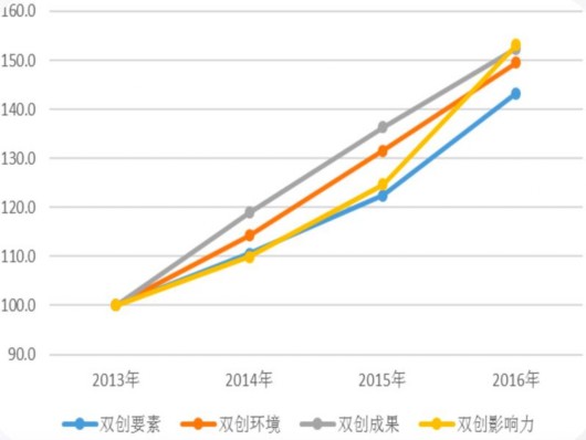 圖片說(shuō)明:楊浦“雙創(chuàng)指數(shù)”4個(gè)一級(jí)指標(biāo)的逐年數(shù)據(jù)變化。