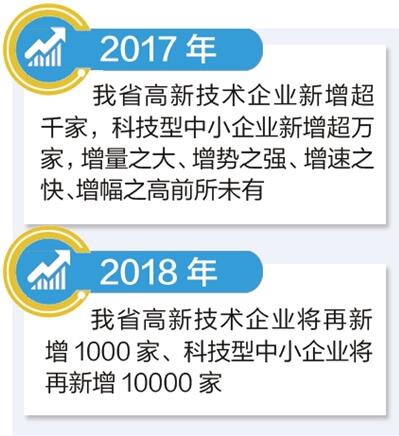 2018年我省高新技術企業(yè)和科技型中小企業(yè)將分別再新增1000家、10000家。記者從2月5日召開的全省科技工作會議上獲悉,到今年底,我省高新技術企業(yè)將超過4000家,科技型中小企業(yè)將達到62000家。