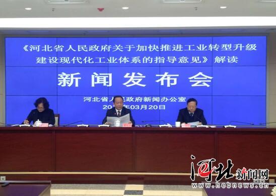 3月20日,河北省政府新聞辦召開新聞發(fā)布會(huì),對(duì)《河北省人民政府關(guān)于加快推進(jìn)工業(yè)轉(zhuǎn)型升級(jí)建設(shè)現(xiàn)代化工業(yè)體系的指導(dǎo)意見》進(jìn)行解讀。圖為發(fā)布會(huì)現(xiàn)場(chǎng)。記者杜昱輝攝