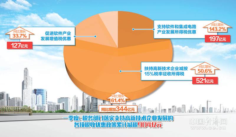 加快建設創(chuàng)新型國家是轉(zhuǎn)變經(jīng)濟發(fā)展方式、轉(zhuǎn)換經(jīng)濟增長動力的必然要求,也是建設現(xiàn)代化經(jīng)濟體系的重要措施。據(jù)國家稅務總局新統(tǒng)計,一季度稅務部門落實支持高新技術企業(yè)發(fā)展的各項稅收優(yōu)惠政策累計減稅904億元,同比增長61.4%。