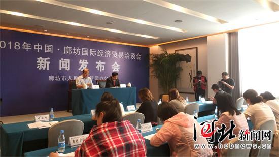 5月14日上午,2018年中國·廊坊國際經(jīng)濟貿(mào)易洽談會召開第二次新聞發(fā)布會。圖為會議現(xiàn)場。通訊員李松潔攝
