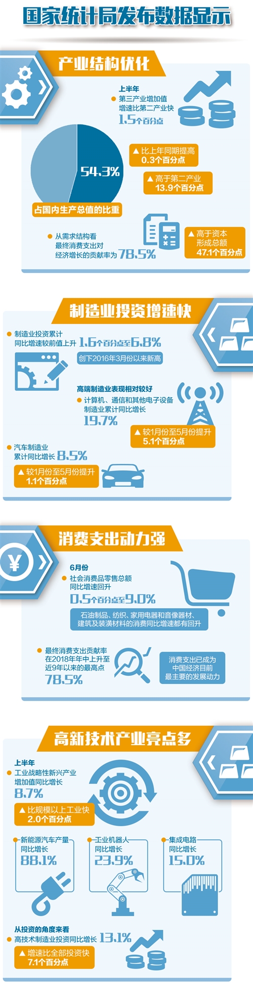 上半年國(guó)民經(jīng)濟(jì)總體平穩(wěn)、穩(wěn)中向好。其中,消費(fèi)支出、產(chǎn)業(yè)升級(jí)和制造業(yè)投資成為結(jié)構(gòu)調(diào)整中的亮點(diǎn),為奮力前行中的中國(guó)經(jīng)濟(jì)提供了穩(wěn)定的支撐。