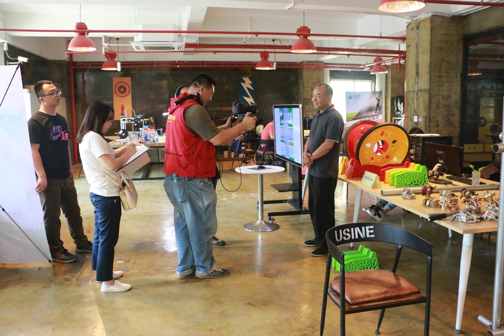 采訪人員首先在DCT創(chuàng)客空間一層創(chuàng)客書吧、項(xiàng)目路演大廳和人才交流展示區(qū)進(jìn)行了拍攝,還采訪了DCT創(chuàng)客空間工作人員周承樸,周承樸介紹了DCT創(chuàng)客空間的服務(wù)理念以及今后將更加積極探索優(yōu)秀的孵化模式,助力更多創(chuàng)客實(shí)現(xiàn)夢(mèng)想。